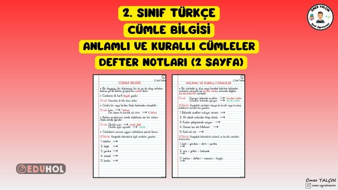 2. Sınıf Türkçe Cümle Bilgisi-Anlamlı Kurallı Cümleler Defter Notları (2 Sayfa)