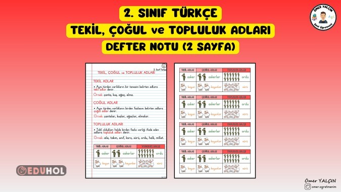 2. SINIF TÜRKÇE TEKİL, ÇOĞUL VE TOPLULUK ADLARI DEFTER NOTU (2 SAYFA)