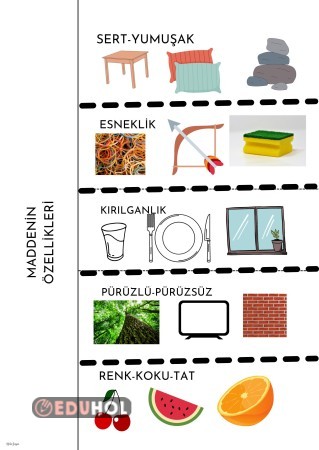Kesik çizgilerden kesilerek maddenin özellikleri kısmı altına yapıştırıcı sürülüp deftere yapıştırılacaktır. Kesilen kısımların altına uygun örnekler yazılabilir