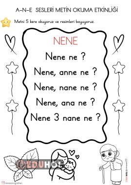 A-N-E sesleri metin okuma etkinliği. Harfleri birleştirme mantığını anlayan öğrenciler için, yavaş yavaş metin okumaya geçmeleri için fayda sağlayacağını düşünüyorum.