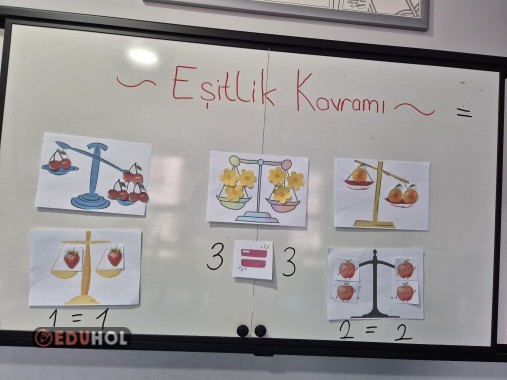 Eşitlik kavramını anlatırken tahtada kullandığım materyaller. Laminasyondan geçirip kullanırsanız daha kalıcı olur.