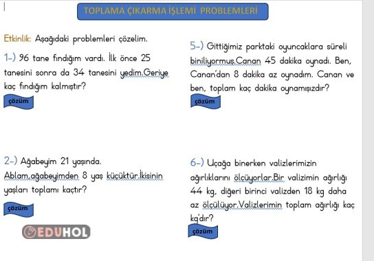 2.SINIF MATEMATİK TOPLAMA VE ÇIKARMA PROBLEMLERİ
