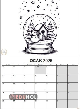 Boyama sayfalıdır. Öğrencilere boyatarak sınıf takvimi oluşturulabilir. Özel günler ve hafta sonları gri tonda belirtilmiştir. Etiketler: 2026 takvim boyama sayfalı yeni yıl yılbaşı