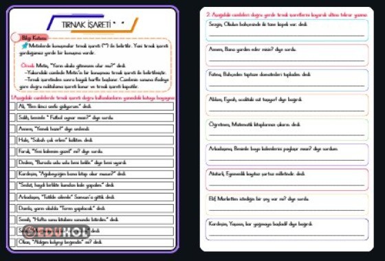 Tırnak işareti konusu ile ilgili kısa konu anlatımı ve etkinlikleri içermektedir. Konu anlatımı defter notu olarak da kullanılabilir. Etkinlikleri beğenmeyi ve takip etmeyi ihmal etmeyiniz. İyi çalışmalar.